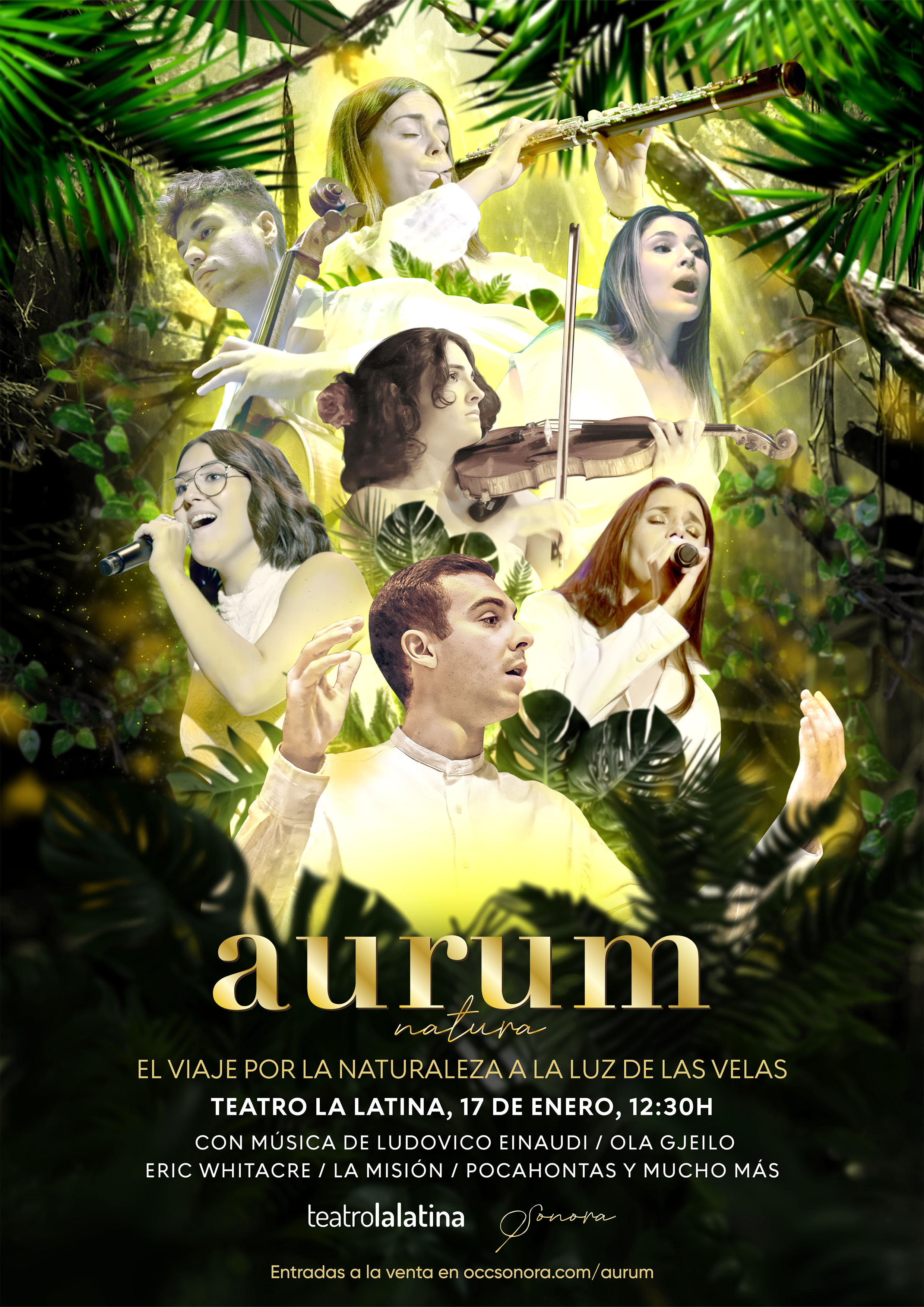 AURUM Natura es una experiencia que combina música en directo, proyección visual e iluminación para crear un espacio de reflexión en torno a la naturaleza. Un espacio único, ambientado con más de mil velas led y proyecciones generadas por inteligencia artificial, que hará viajar al espectador a través de un paisaje sonoro y visual.